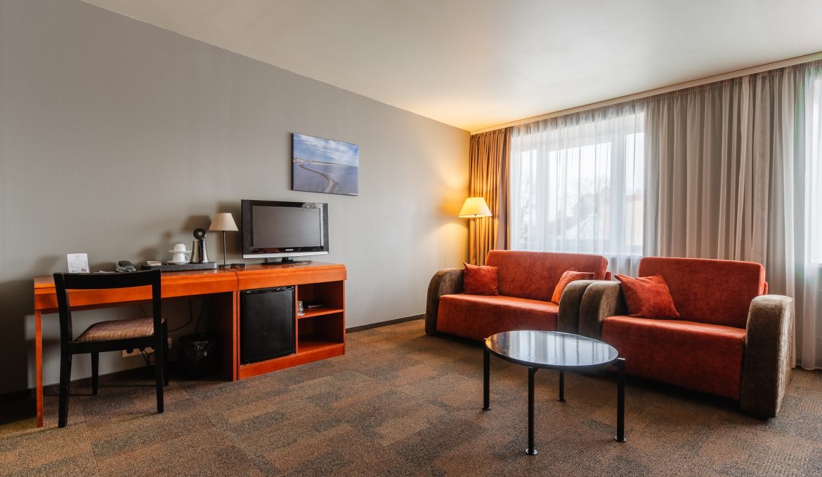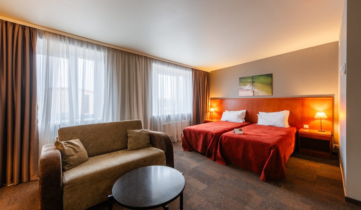 Business-Doppelzimmer. Zimmerfläche ca. 30 m2. Zimmerausstattung: Ein oder zwei Zimmer, Doppelbett (160 oder 180 x 200 cm) oder zwei Einzelbetten (90 x 200 cm), Schreibtisch mit einem Stuhl, WLAN, Fernseher, Telefon, Kleiderschrank, Wasserkocher, Gepäckständer, ein weiteres Bett möglich (zusätzliches Sofa und/oder ausziehbare Couch), Badezimmer mit Badewanne oder Dusche und WC, Haartrockner und Fußbodenheizung im Badezimmer. Ein Zimmer ist mit einer Klimaanlage und zwei Zimmer sind mit einem Deckenventilator ausgestattet.